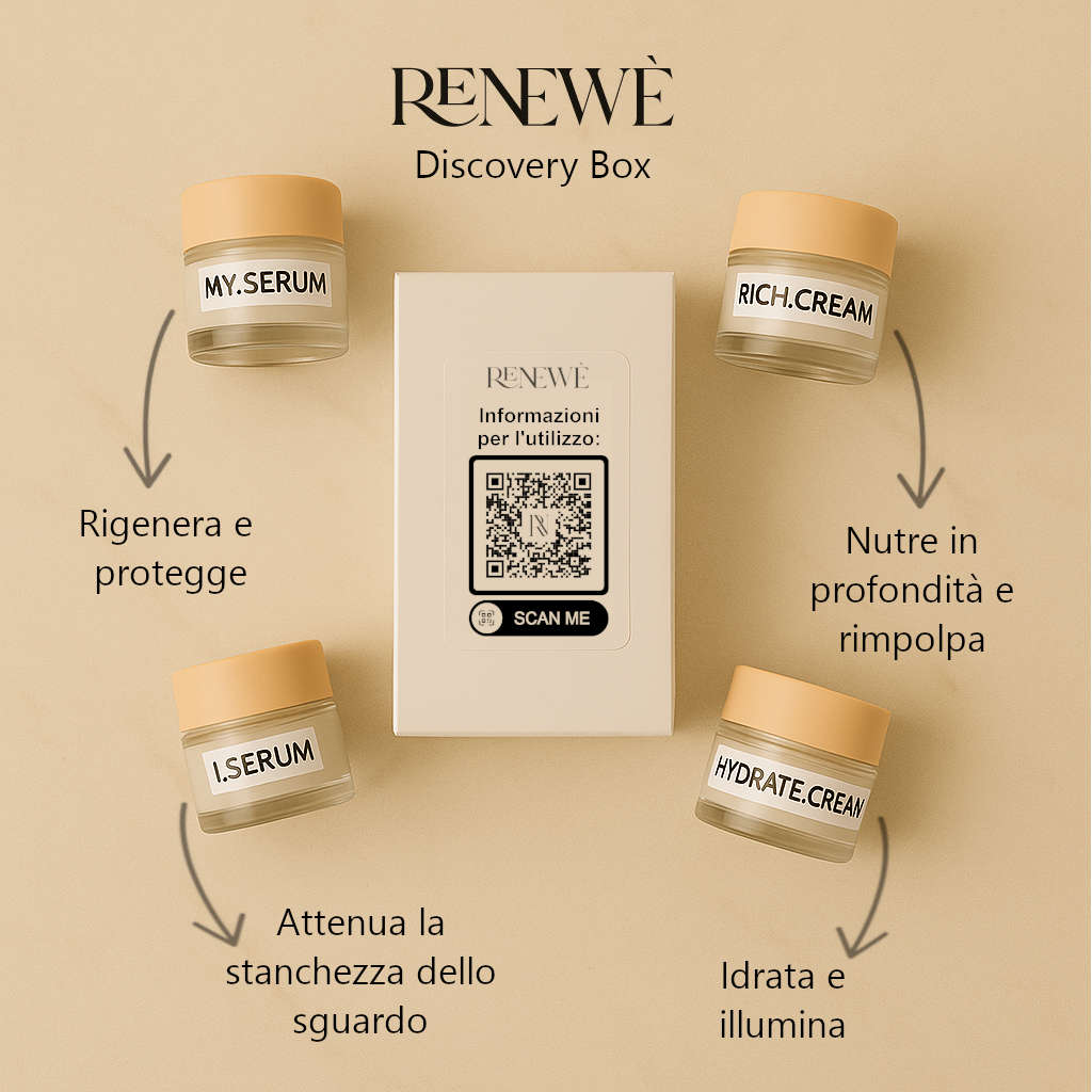 Con l'acquisto riceverai il link alla guida della Discovery Box, per accompagnarti passo dopo passo ad identificare i prodotti Renewè® più adatti alle tue esigenze.